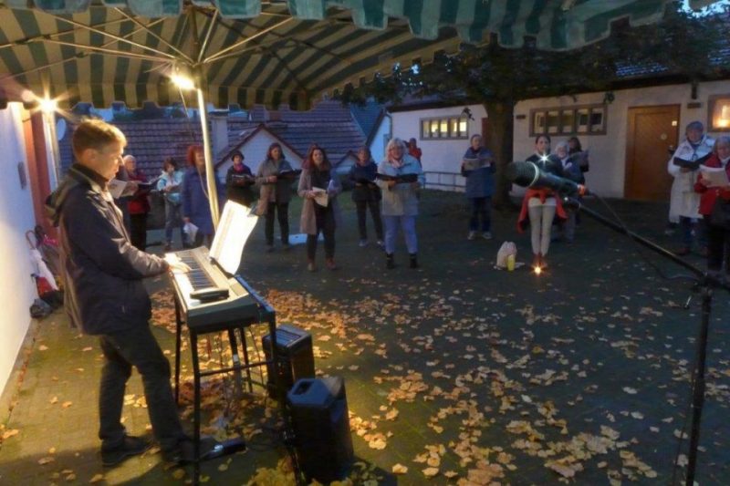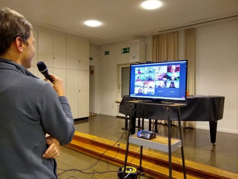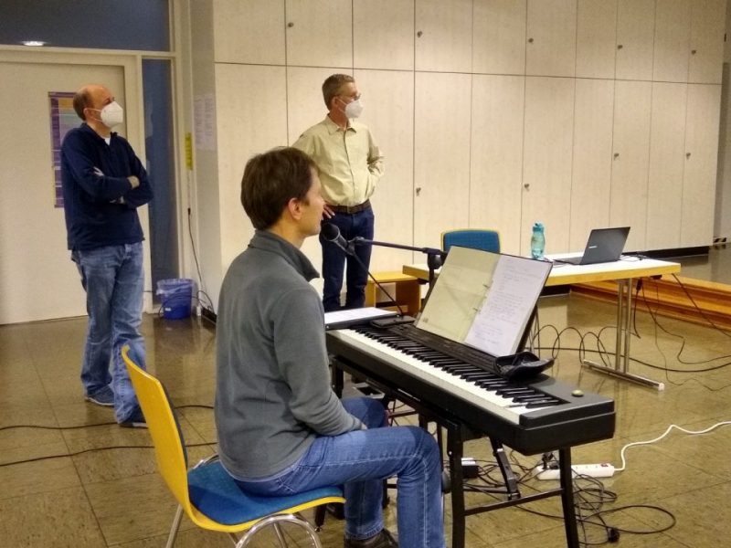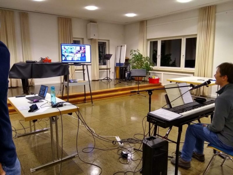 Wir haben auch während der Corona Pandemie unsere Proben tapfer weiter geführt, als Zoom-Meeting oder auf dem Kirchplatz mit mindestens 1,5 m Abstand zueinander.